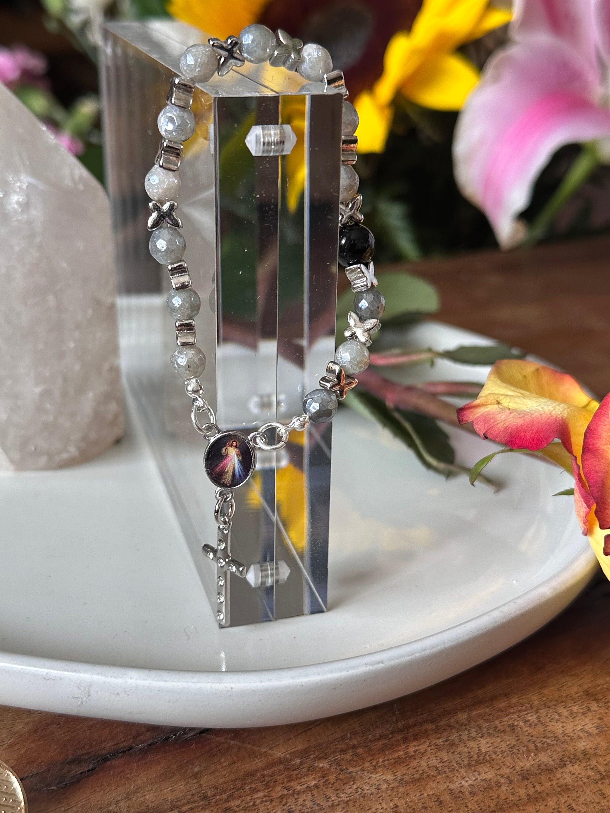 Bracelet with Labradorite Gemstones, Black Onyx Gemstone, Silver Tones Butterfly Shaped Beads, Silver Plated Cross, and Silver Toned Charm.