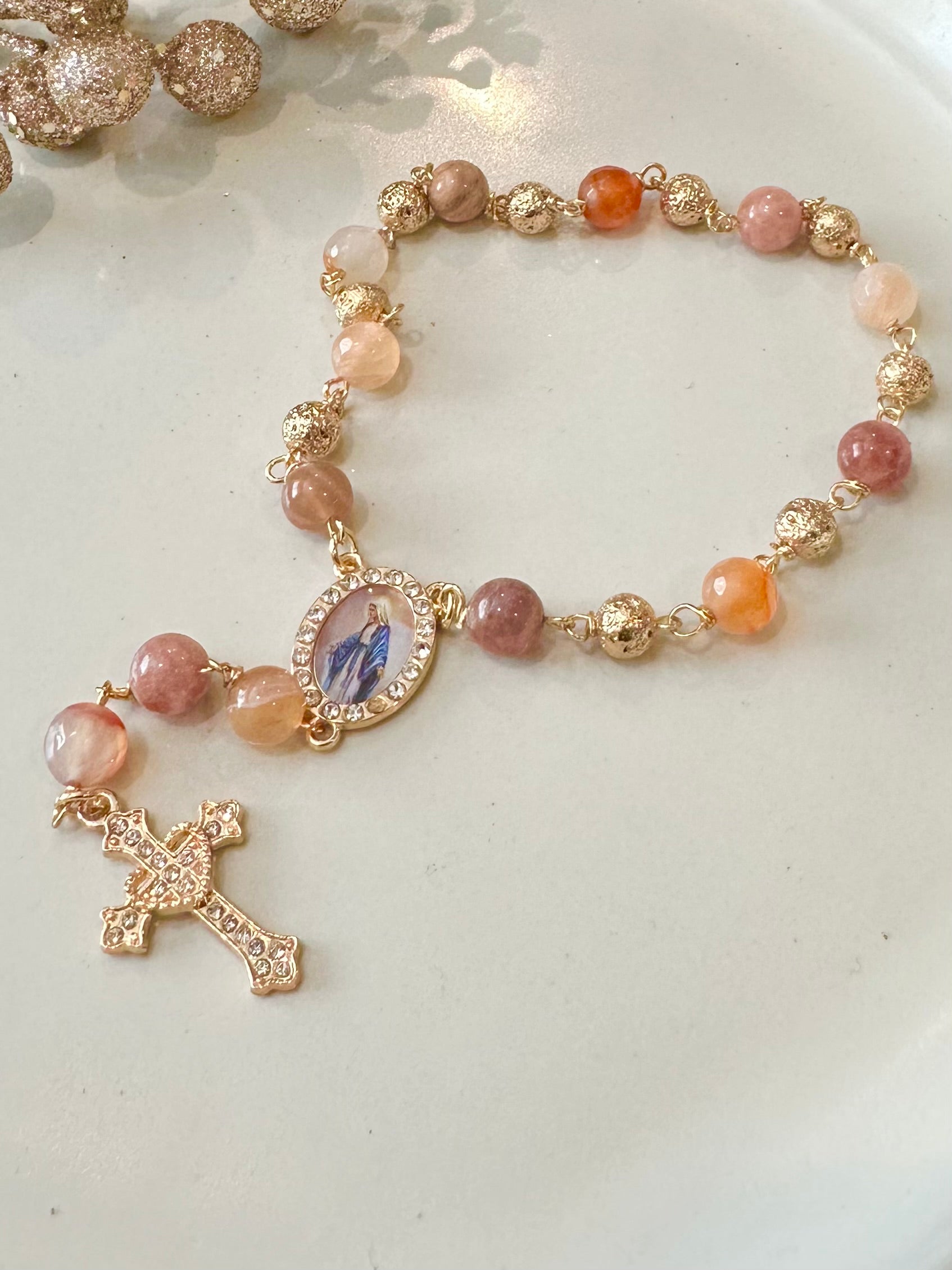Rosary Bracelet in beautiful moonstone beads, gold toned charm and Crucifix, and 18k Gold Plated wire and center beads/findings.
