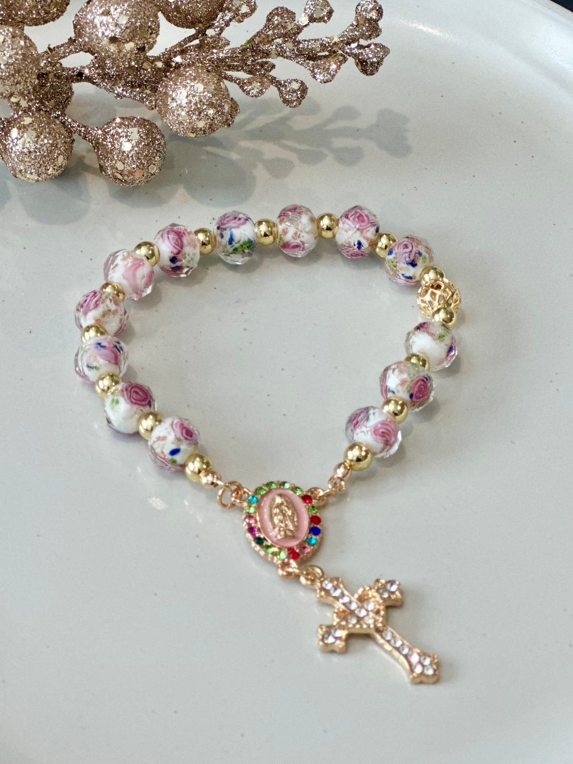 Rosary Bracelet made with crystal Rose Design beads, Gold toned charm and crucifix, and 18k Gold Plated wire and center beads.